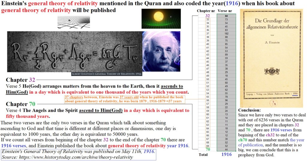 It’s Strange that when we counted the Ayaat between Both Suras which these 2 Ayaat were Quoted we found the Total of Ayaat are 1969 which is Exactly the Year when Einstein Published his Book. Einstein was 37 years old when he published his Book as he was born in 1879 and published his book in 1916. What is Strange is between the 2 Suras (Chapters) which these 2 Ayaat were Quoted there are Exactly 37 Suras!!!!!!!!!