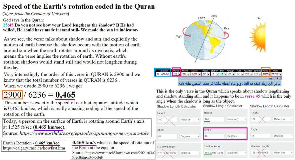 The Ayat (Verse) Number 45 From Surat (Chapter) 25 In the Quran which speaks about Shadow. Shadows is the result of Earth Rotation and it’s relationship with the Sun. So Earth Spinning is the main cause of The Earth Shadows. This Ayat deals with Earth Spinning. When we checked the Position of this Ayat from the beginning if the Quran we find it’s Ayat Number 2900 and if we divide by the Total of the Verses of the Quran we get a surprise. 2900/6236=0.465 The 0.465 km/sec is Exactly the Speed of the Earth’s Rotation on it’s own axis.