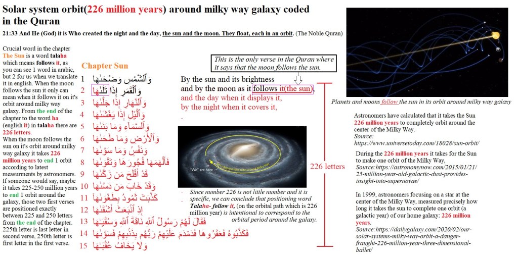 Quan is Hinting to the 226 Solar System Orbit around the Milky Way Galaxy. In Another Research we have also seen the Research on the Distance between the Earth and the Sun which os also Coded in this same Chapter. The Core and Surface Temperature too are Coded. Allahu Akbar. This Information shows that the same who created the Heaven and Earth is the same who Revealed Quran and this Book is 100% Authentic. Allahu Akbar