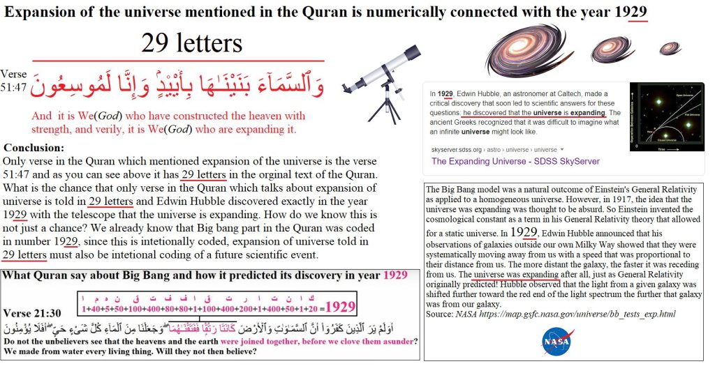 What is more strange is when we Change the Letters of these 3 words into their Values (Numbers which were used in the 7th Century. The Arabs used Numbers to represent Letters) we get the Total of these letters as 1929 which turns out to be the year When The Expansion of the Universe was Confirmed by Edwin Hubble. (By 1929, Hubble had completely reimagined our place in the universe; not only was it home to millions of other galaxies, but the universe itself was expanding as well. Contrary to the previously held view of a static universe, Hubble ultimately proved that galaxies are, in fact, moving away from us). So if its Expanding then if we Reverse this Expansion then the Universe was Joined together and compacted Exactly as the Quran Says in this Ayat. Allahu Akbar!!!!!!! Find beloe the Slide for more Information on these both Facts.