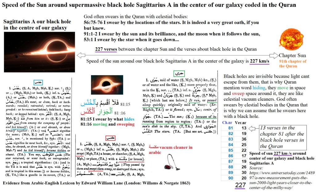 what is amazing is that 227 is the speed in Km/second of the Sun during it’s rotation around the Galaxy and There is also a Black hole in the middle known as Sagittarius A. So the Sun rotates it in this speed. Quran hints this speed. Allahu Akbar. The below Slide gives you more information.