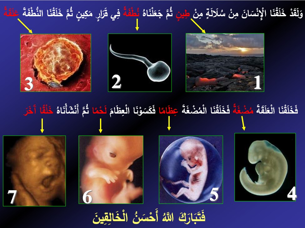 مُضْغَةً 4 فَخَلَقْنَا الْمُضْغَةَ عِظَامًا 5 فَكَسَوْنَا الْعِظَامَ لَحْمًا 6 ثُمَّ أَنْشَأْنَاهُ خَلْقًا آخَرَ 7 فَتَبَارَكَ اللَّهُ أَحْسَنُ الْخَالِقِينَ