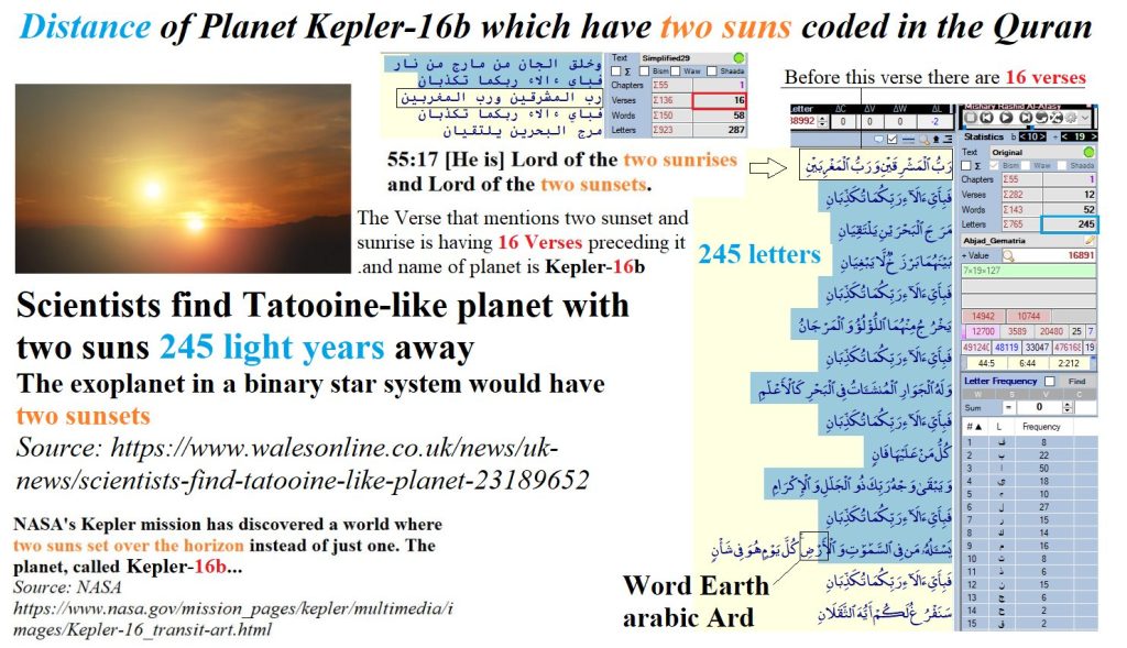 The Slides are Self Explanatory. Allah has used the Dual Word East and West means there are two Points of the Sun Rises and two Points of the Sun Sets on the New Planet discovered Recently known as Kepler-16h. Its Strange that The name Kepler 16h correspond to the 16 Ayaat (verses) From the beginning of Surat Number 55 to the Ayat Number 16 Just before The Ayat Number 17 which mentions Dual Easts and Wests as if these 15 Ayaat pointing to The Ayat number 17. This is First Hint. And if we count between Ayat Number 17 which mentions East and West and the Beginning of the word Al-Ardh (Earth) In the Ayat Number 29 we get 245 Arabic Letters corresponding to the Distance in light years between Earth and Kepler-16h. And this is the second Hint!!! proving that This Ayat (Verse) is giving us another Information on Kwpler-16h Allahu Akbar (God is Great). So this Ayat Tells us about Kepler which was discovered recently. Really Quran is one of the greatest miracles of all times!!!!!