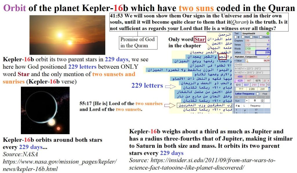 The below slide shows more hints proving that this Verse is hinting on the new planet Kepler-16h. Between the Word Al-NAJM (Star) on Ayat (Verse) Number 6 of the same Surah and Ayat (verse) Number 17 which mentions 2 Easts and 2 Wests there are 229 Arabic letters corresponding to 229 Days of the Kepler-16h Orbit around it’s x2 Stars (Suns). So This is the 3rd Hint (Proof) That this Ayat is pointing to the Kepler Planet which is just recently discovered. These Proofs confirms that Quran is 100% Genuine and It’s the word of Allah.