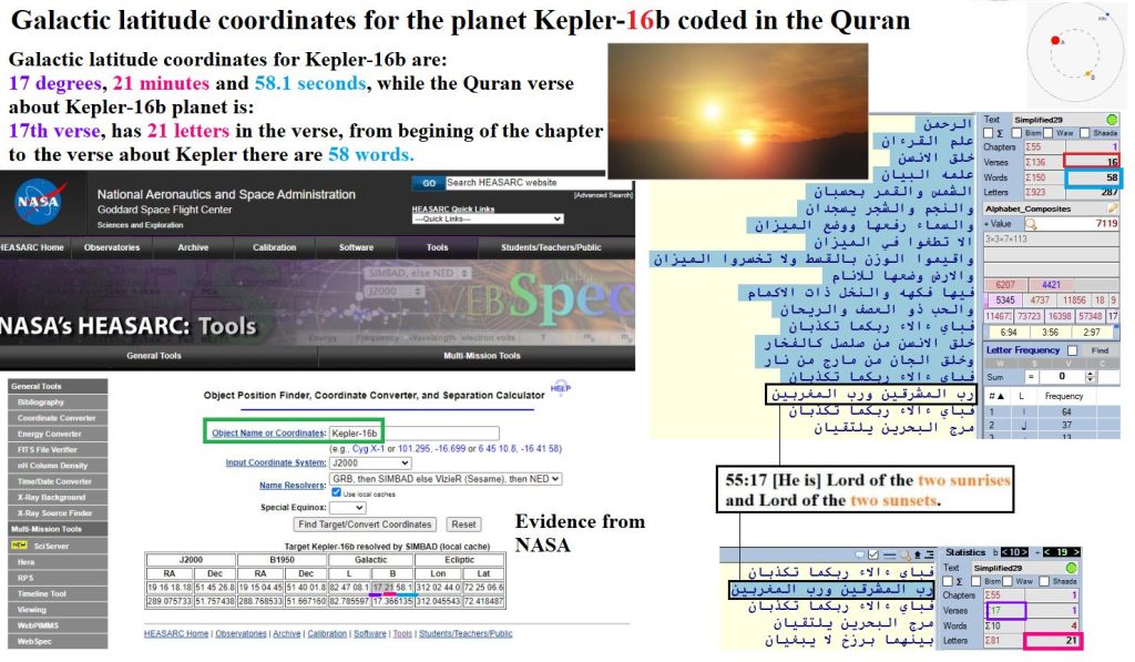 Number 17 / It has 21 letters/ 58 Words from the beginning of the Surat (Chapter 55) until the Ayat Number 16 just before the Ayat about Kepler. So we have exactly same as the Galactic Measurements. Do you see this Miracle. Who Taught Prophet Mohamad this Science. At that time Kepler was not discovered. Allah Akbar