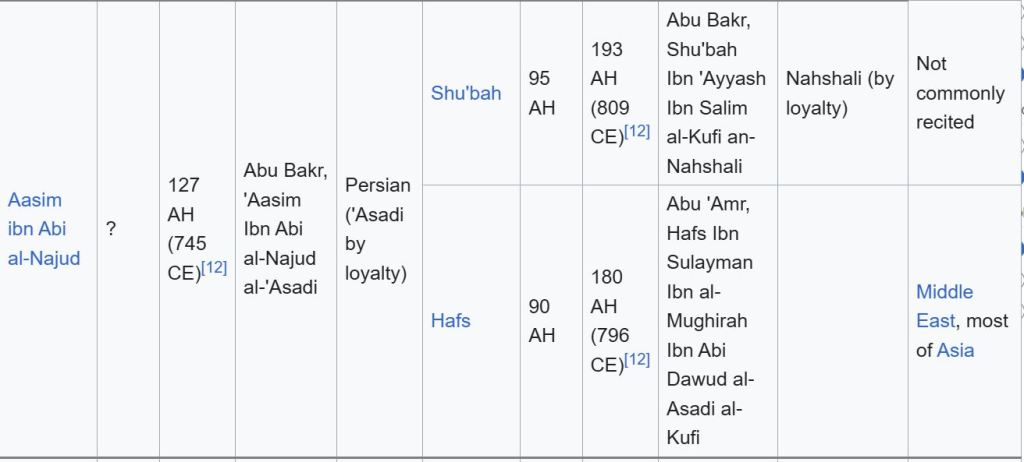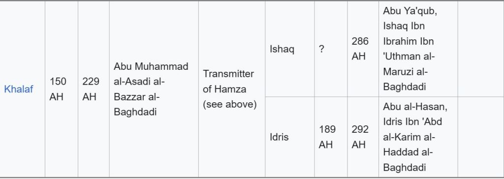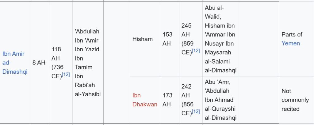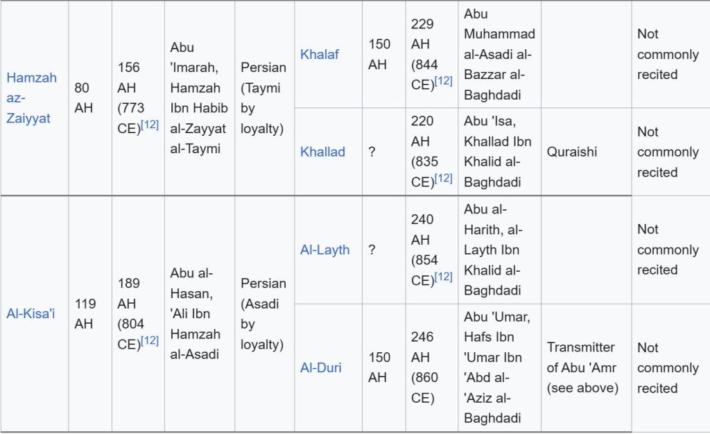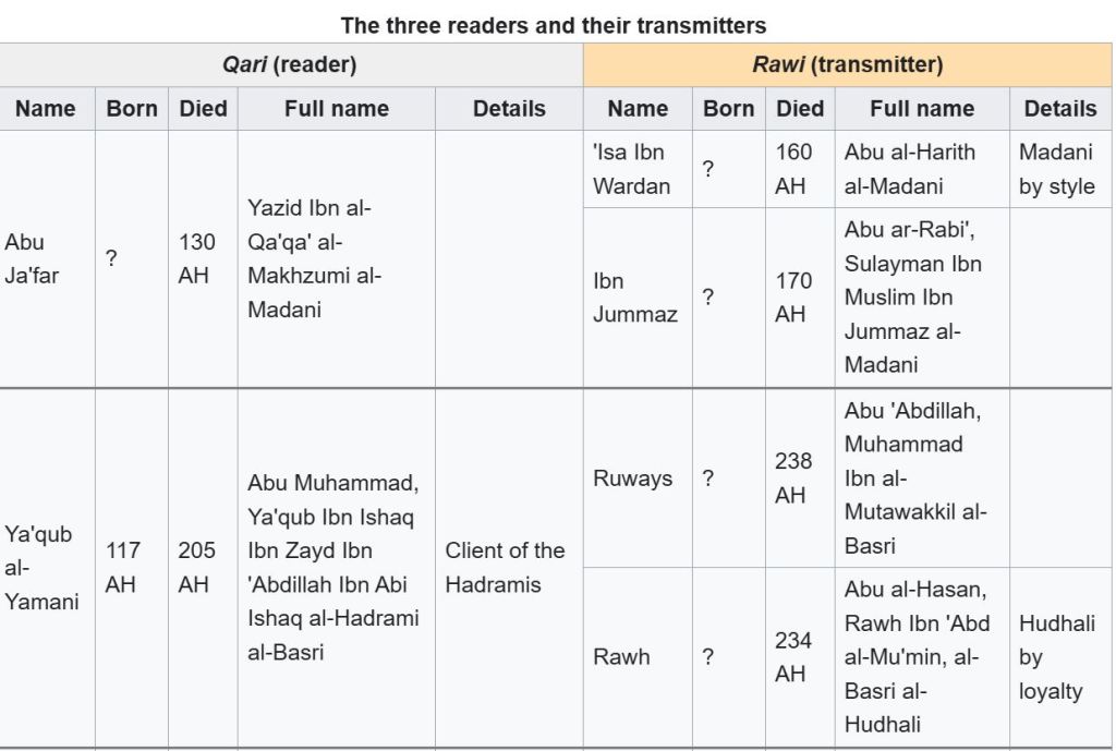 There are also further three Qira’at, (sometimes known as “the three after the seven”), that provide additional variants.[37] These three—named after Abu Jafar, Ya’qub and Khalaf—were added to the canonical seven centuries later by ibn al-Jazari (d.1429 CE) though they were popular since the time of the seven.[38] They are mashhur (literally “famous”, “well-known”. “these are slightly less wide in their transmission, but still so wide as to make error highly unlikely”).