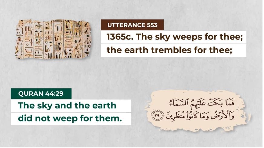 Contrary to what is mentioned in the Pyramid Texts, the Qur’an makes it clear that the sky and the earth did not weep for this dead pharaoh, i.e. they did not mourn his death. Since the phrase “sky and the earth did not weep” is used in the Quran only when talking about the destruction of the Pharaoh, one cannot call this a coincidence.
