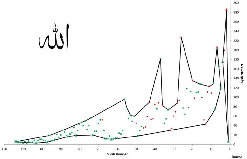 The Signature of Allah by Plotting the Ayaat and Chapter numbers on the Graph can be found by joining the Outer Points and this is one of the Miracles which you can’t do that with any book or name. This is a Miracle of the Quran among endless of Miracles. The Chapter Numbers is Plotted on X-Axis from 1 to 114 and The Verses (Ayaat) Numbers on the Y-Axix. Chapter one will have 286 Verses. The Chapter with has many Verses is Surat Al-Baqarah which has 286. After Plotting Chapter Numbers and Ayaat join the outer Points and by connecting them you will end up with the name of Allah!!!!!!!! If we can find the Name of Allah in his creation then why not in the Quran which is his words.