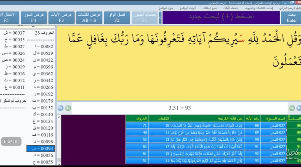If we count all the letters TWA in this Chapter you will find 27 letters corresponding to the Number of Surah which is 27 and when we count all the Letters SIN in this Chapter we will find the total as 93 which corresponds to the Number of the Verses of this Surat or Chapter. You can Immediately see one aspect of the function of these letters that they act like Lockers to protect the Quran from manipulation as removing only one word containing one of these letters means removing this divine balance which you can see and check yourself. as the below picture shows the results from the Quran Counter. And what is more astonishing is Numbering the Chapters and Verses of the Quran was done many years later after the revelation and today with the help of various programs we discover endless of Miracles like this one.