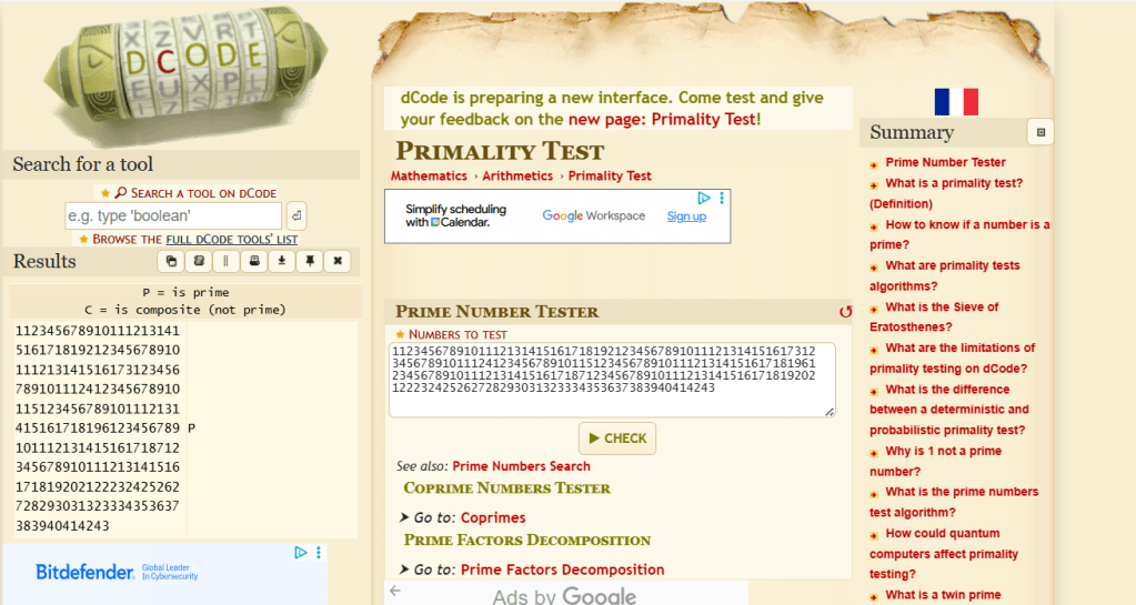The 222-digit number when verified in a Primary Test we found it is a Prime Number, This is an interesting phenomenon! Below are the Prime Test Results; on the left, it shows as Prime, and on the right, the long number with the result is displayed.