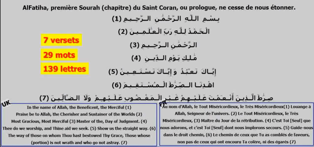 The first Picture shows the Quranic Verses of The Chapter Number 1 Surat Al-Fatiha showing there are 7 Verses, 29 Words and 139 Letters