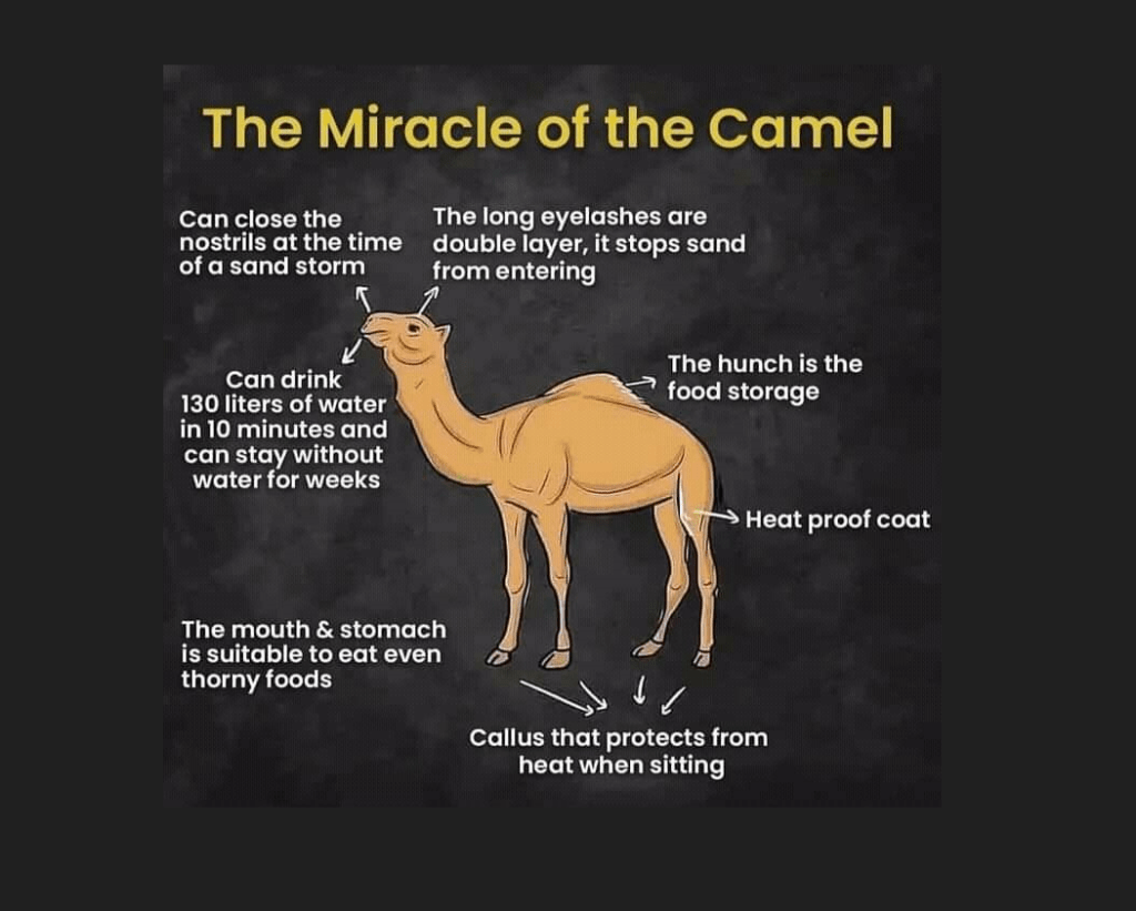 While a fish is special for breathing underwater and a bird is special for flying, the camel is a “biological miracle” because it breaks the normal rules of how mammals stay alive. It can lose of its body weight in water and keep walking, while a human or a horse would die after losing only .