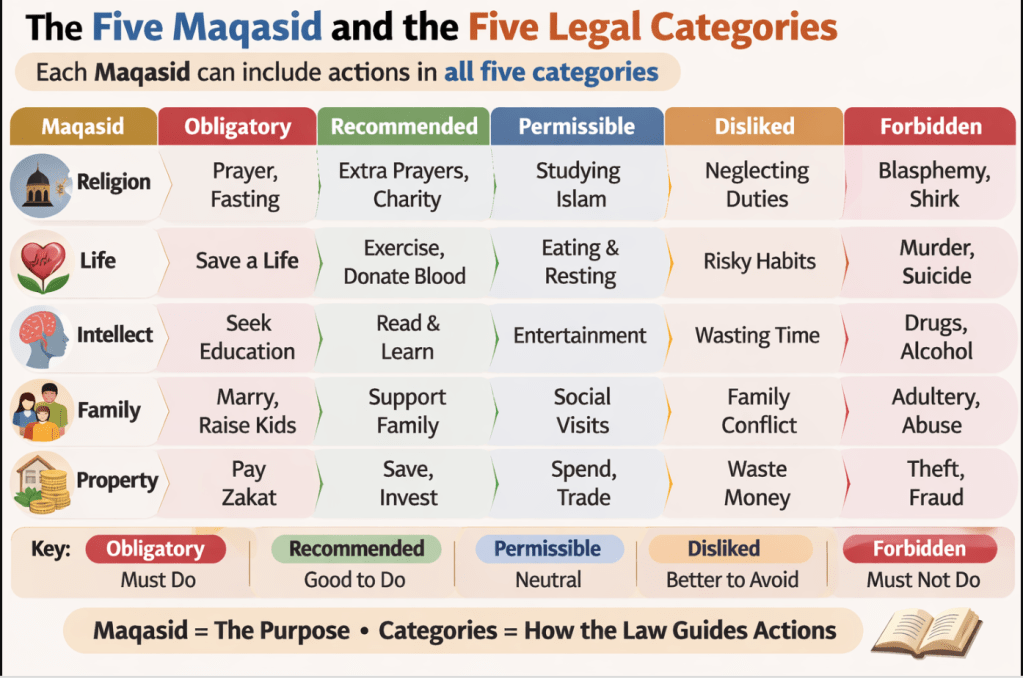 | Issue / Case | Maqasid (Goal) | Level (Priority) | Maxim Used | Final Ruling (Category) | Explanation |