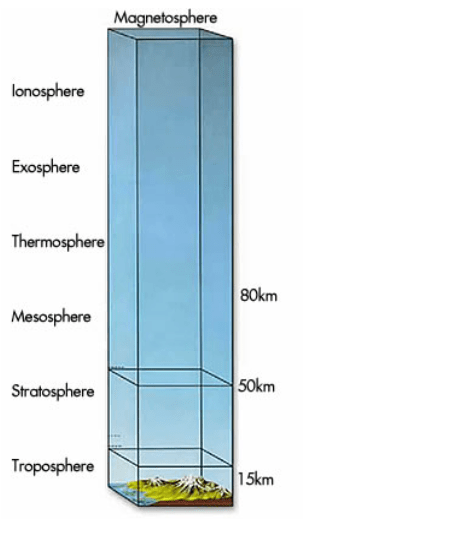 1. Troposphere (0 to 10–15 km) This is the layer where we live, breathe, and where all our weather happens—rain, snow, and clouds.[3] [4] It is the densest layer, containing most of the air we need to survive. As you go higher, the air gets colder.