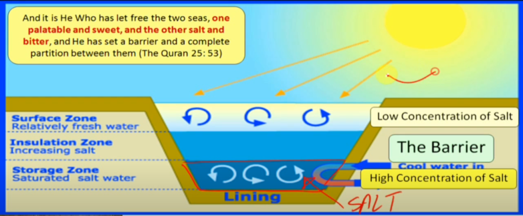 Hii Ndiyo Solar Pond ambayo Wataalamu Wanatumia Maji Yaliyopigwa na Jua katika kutengeneza UMEME. Allahu Akbar. Je unaona Aya Ya Kuruani inavyosema kuhusu bahari mbili ya maji matamu na ya chumvi. Baina ya maji haya ya cumvi na matamu kuna sehemu inayojulikana kama Barzakh (Transit) na sehemu hii inasaidia maisha ya viumbe vinavyoishi katika sehemu hizo kuhama kwa kupitia hapo mpaka wanapozoea mazingara hayo na kisha watahamia upande wowote bila tatizo na siyo moja kwa moja kwani ni hatrari. Hapo katikati (Barzakh) maji yana chumvi ya katikati siyo kwa wingi wa kuleta madhara na siyo kidogo sana. Habari hii ni kweli. Angalia Picha hizi na Faida yake.