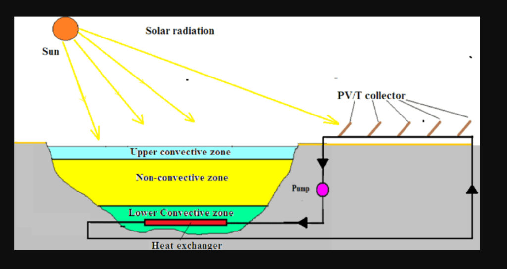 -Power production: A solar pond can be used to generate electricity by driving a thermo electric device or a Rankine cycle engine. The organic working fluid produces mechanical power in a Rankine cycle, which in turn generates electrical power using an alternator.