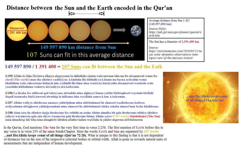 When we count the words between The word الارض (Earth) of the Quran Surat Number 2 Ayat Number 255 and The word بالشمس (Sun) of Surat Number 2 Ayat Number 288 we will get exactly 107 Words which Hints to the Distance between the Sun and Earth. So the Same Suras (Chapters) and Same Ayaat (Verses). as the Previous Research here above (The Diameter of The Sun And Earth) gives us The Distance between the Sun and Earth and also as we have seen above we also get the Sun and Earth Diameters!!!!!! I can’t believe myself. Its really amazing. Quran is one of the Greatest Miracles of the Miracles. It’s beyond our capacity to explain. we only say “Allahu Akbar” (God is the Greatest)