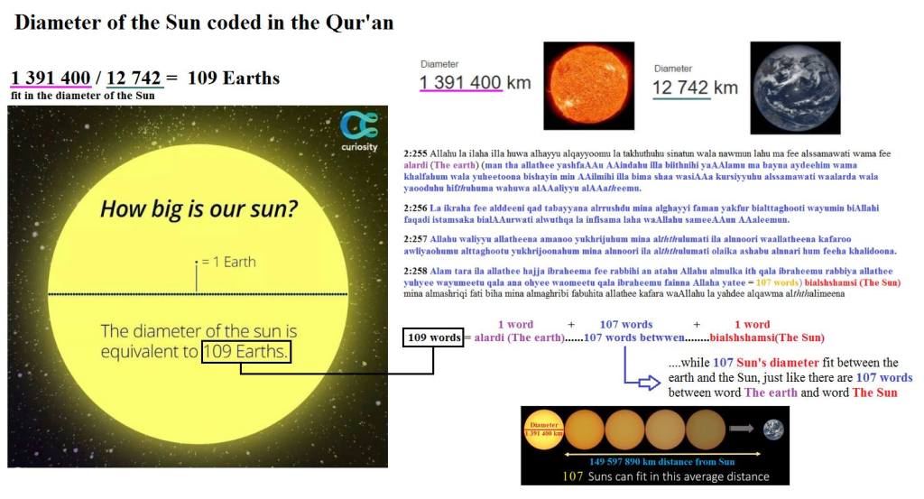 If we count the words From The word الارض of the Quran Surat Number 2 Ayat Number 255 To The word بالشمس of Surat Number 2 Ayat Number 288 we will get exactly 109 Words which Hints to the Diameter of both the Sun and Earth and their relationship!!!!!!