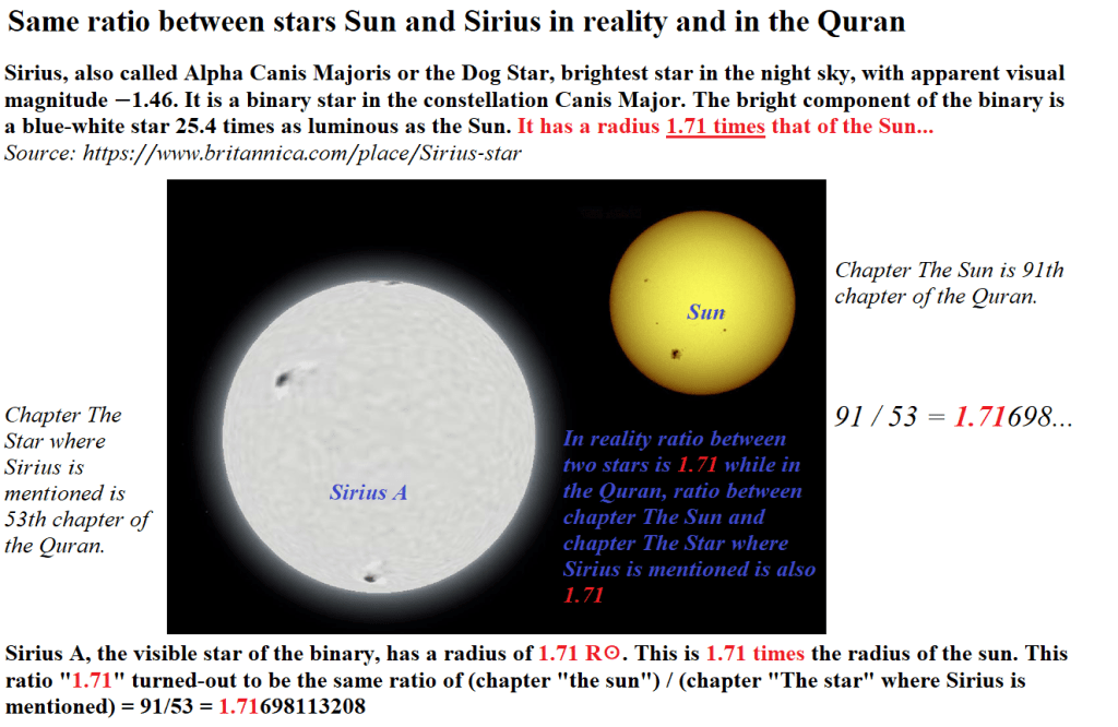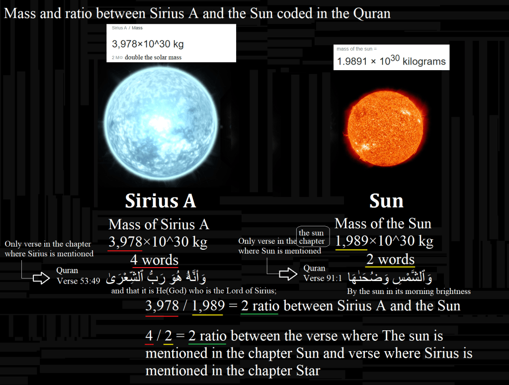 If we divide the Mass of the Star Sirius A by The Mass of The Sun we get the RATIO 2 (3.978/1989=2) and From the Quran The Ayat (Verse) which mention Sirius Star is Number 49 From Surat (Chapter)Number 53 has 4 Words and If we divide these 4 Words by the 2 Words of The Ayat Number one From the Surat Known as the SUN (Chapter Number 91) we get Ratio 2 . (4/2=2)Quran and Science has no any Contradiction. Science can go wrong but not Quran. No Mistakes in the Quran. It’s the word of Allah (God) the Creator of everything.