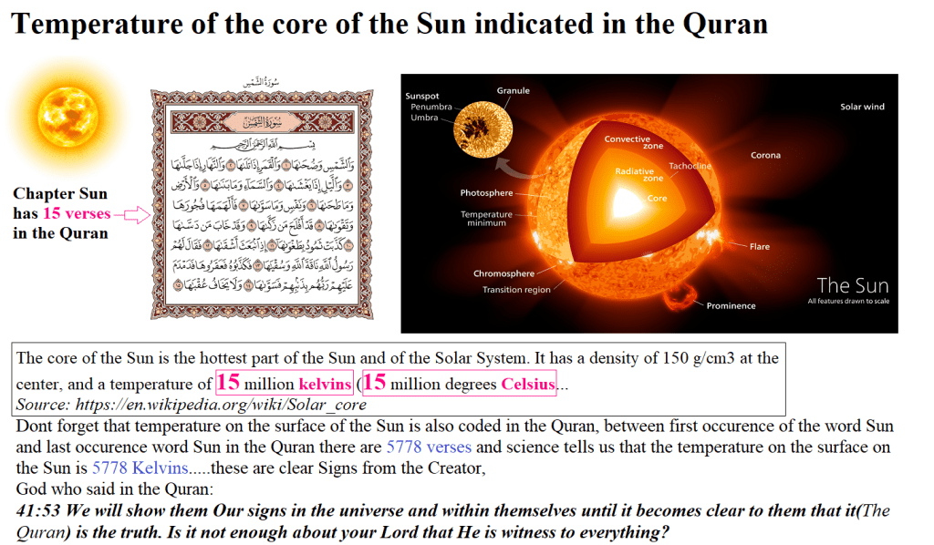 So we get both in the Quran; The Surface and Core Temperature. So here let’s think. How it comes that we get 100% correct each time we make calculations. What is this Book about? It’s impossible. Let’s meditate. If you wish you can go and count yourself and i will help you to do that if you require my help just write to me from the Welcome Page and I will direct you to do checks yourself and don’t worry it’s free as I do only for Allah and need no reward. Allahu Akbar.