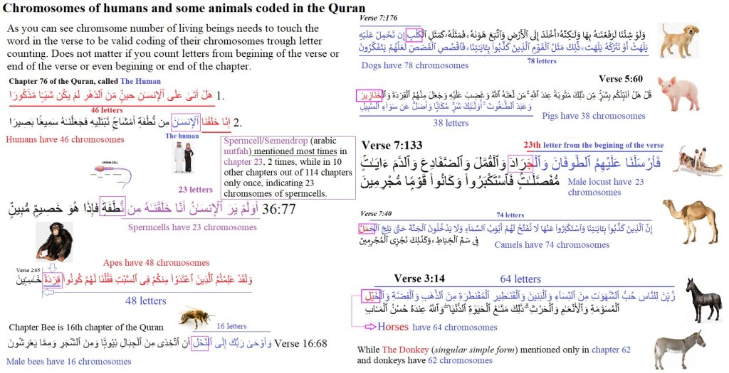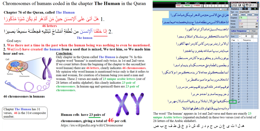 The Below Research is amazing. The 2 Ayaat (Verses) from the Quran from Surat (Chapter) number 76 known as Al-INSAN which means THE HUMAN provides us with 46 Chromosomes of Male and Female Human Being. (x2 Pairs of 23 Chromosomes) The Chapter itself is know as HUMAN. and when we count the Letters from the beginning of the first AYAT to the word AL-INSAN (The HUMAN) of the second AYAT we get a total of 46 Letters. This shows all the letters before this word were pointing to the word “HUMAN”. which in turn we discover the number of the Human Chromosomes. And not only this strange discovery but also the letters of both Ayaat (Verses) used (I mean the non-repeated ones) are only 23 from the total of 28 Arabic Letters!!!!!.) This Surah (Chapter has 31 Ayaat (Verses) and again when we checked the Mathematic Prime and Composite Numbers Table we found that Number 46 is the 31st Composite Number!!!!! pointing to the total of the Ayaat (Verses) of this Surah. This High level of Engineering is presented in the Quran too!!!