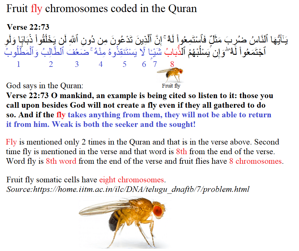 The Chromosome of the Fruit Fly is 8 and the below slide show 8 words if we count from the word ADHUBAB (FLY) to the end we get 8 words too!!!! it’s really strange. Quran is always Perfect. No Errors in the Quran. When Scientists go wrong Quran will always be correct. Quran is not a Scientific book but it has information to authenticate itself. The Information is from Allah who is the creator of the universe(s). Allahu Akbar.
