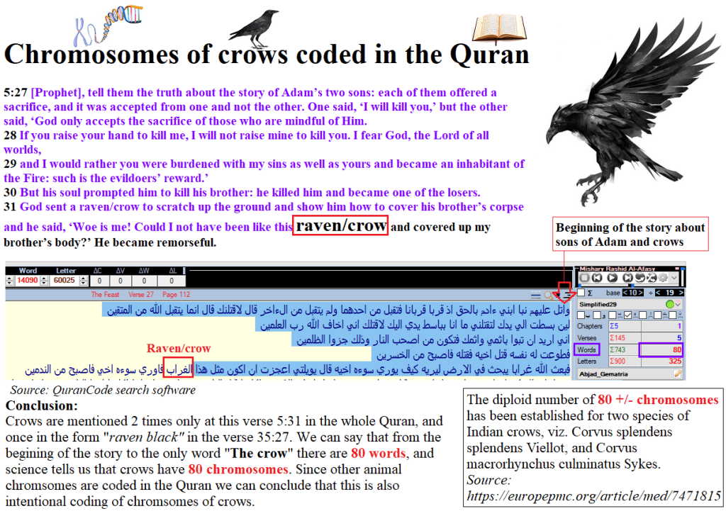 In the Quran, the word “crow” is mentioned twice. One mention is in Surah 5, Ayah 31, where a crow teaches Adam how to bury a dead body. The other mention is in Surah 35, Ayah 27, where the black colour of some mountains is compared to a crow. In both Ayaat we get the 80 Chromosomes of the CROW. The below slide shows the counting of words from the beginning of the story about Adam and the Crow to the word HADHA (This) Just before the word CROW. if we count them we get 80 words. So all the words here are pointing to the CROW!!!!