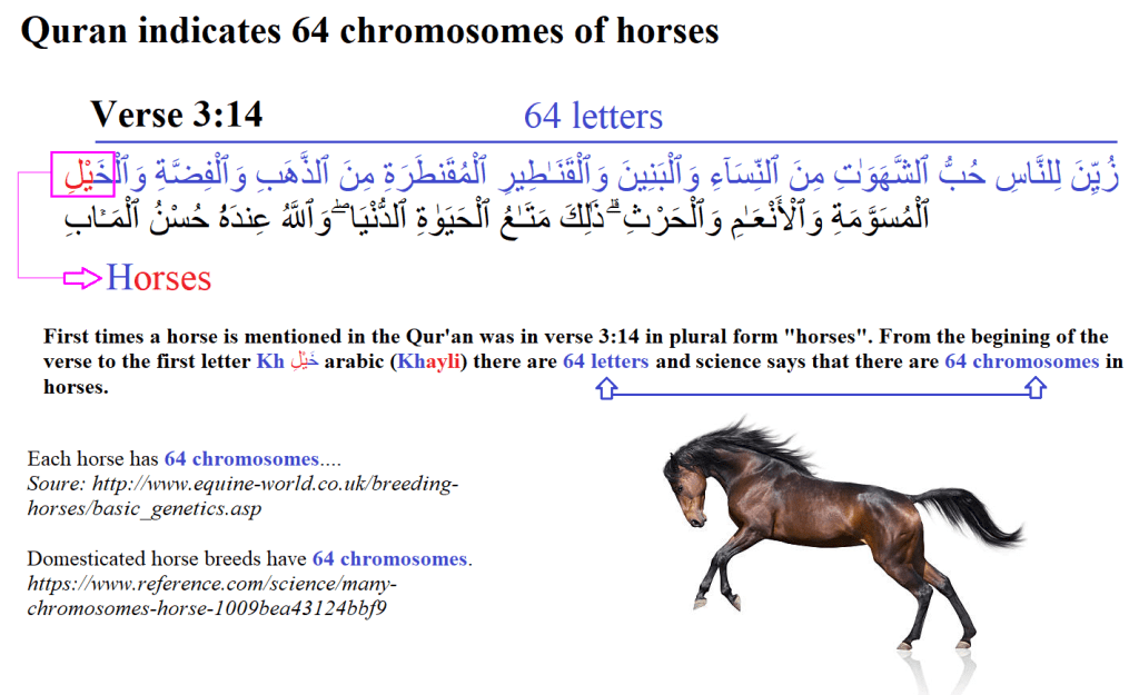 The first Ayat in the Quran which mentions the word “AL_KHAYL” which means Horse is Number 14 Surat Number 3 and as below if we count the letters (Uthmanic Script) from the beginning of the Ayat to the first letter of the word HORSE which is letter KHA we get a total of 64 letters. Science says that the Horse has 64 Chromosomes (32 Pairs from male and 32 from Female).