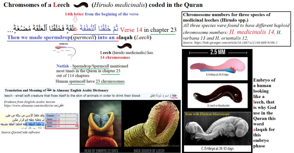 It is intriguing to note that the scientific study of some species of leeches has revealed that they have 14 individual chromosomes. The similarity in shape between the leech and the cells during the “alaqah” stage has been scientifically documented. This adds another layer of significance to the divine message present in the Quran, as it subtly alludes to the chromosome count of leeches.