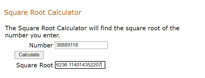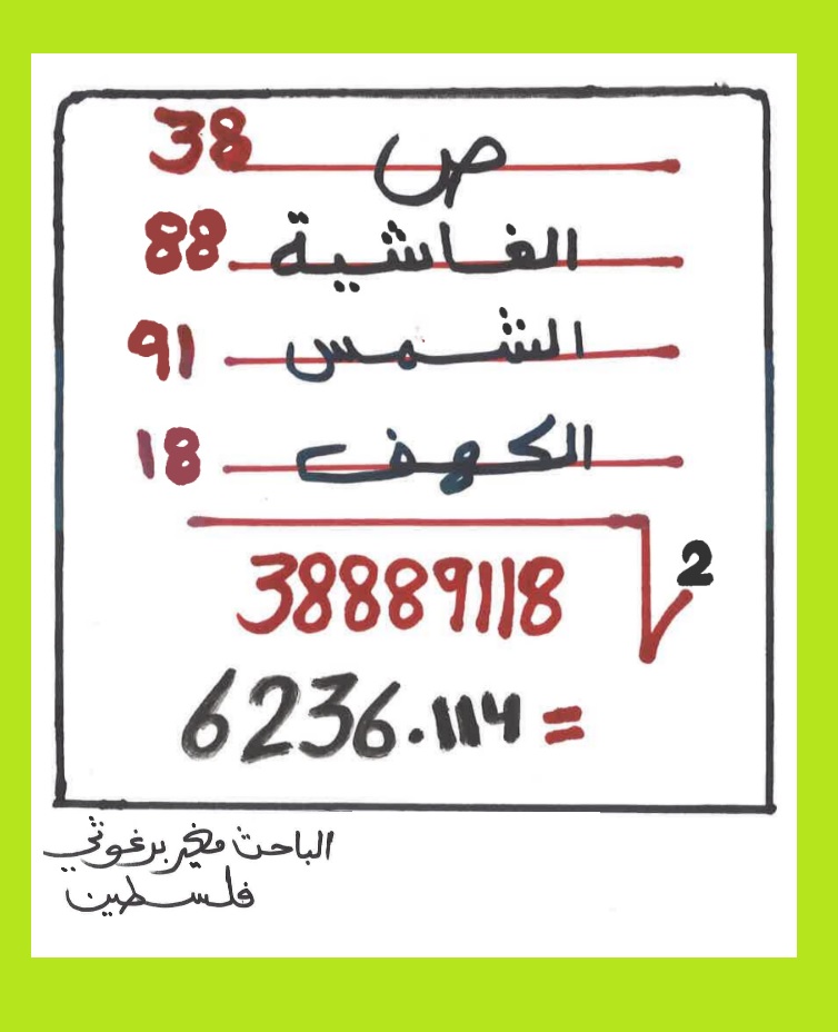 38889118 and when we calculate the Square Root of this number we will get exactly 6236.114 and it’s strange that 6236 is the Total of Quraninc Ayaat (Verses) and 114 is the Total of Quranic Suras.!!!!