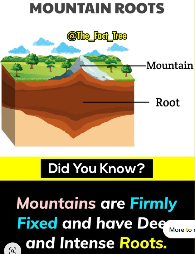 Milima na Mizizi mikubwa kama Kuruani ilivyosema kwamba Milima ni Kama Vigingi. Na kwa kawaida Vigingi chini ya Ardhi ni Virefu kuliko juu ya Ardhi. Ukijenga Hema basi utazamisha kigingi chini kwa urefu zaidi kuliko juu ili ulidhibiti hema lako vizuri zaidi.