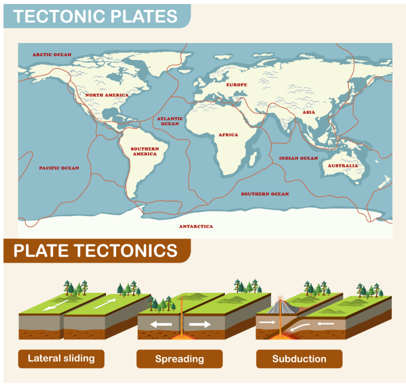 The Earth’s outer crust (the lithosphere) is composed of a series of tectonic plates that move on a hot flowing mantle layer called the asthenosphere.