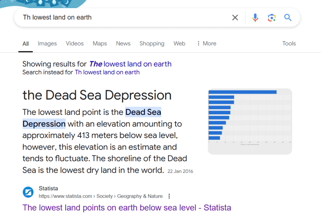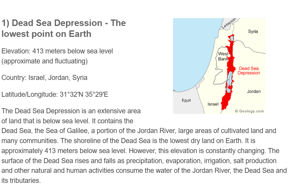 Wataalamu kwa kutumia Vyombo vya utafiti wa hali ya juu wamegundua hivi karibuni kwamba Sehemu hiyo ambayo inajulikana kama Dead Sea Basin ndiyo sehemu ya Chini sana Duniani kwa vipimo vya Bahari. (395 Metres below the sea level).