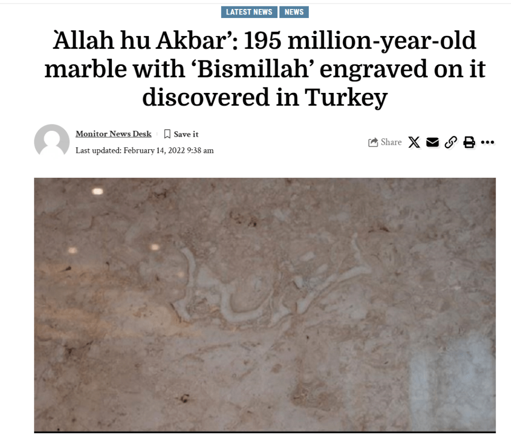 (The marking that appear to form Bismillah, or In the name of God, was on a marble slab found in a marble quarry in Turkiye’s Mediterranean province of Antalya. The discovery was made in the marble business area of Antalya Marble Industry and Trade Company in Taskesigi village of the Antalya Korkuteli district. The figure that appeared on the stone attracted the attention of miners while the stone was being processed in the quarry. Removing dust from the stone, workers noticed the marking appeared to spell “Bismillah” in Arabic letters. The slab was then sent to Suleyman Demirel University in Turkiye’s southwestern Isparta province for analysis. Scientists Fuzuli Yagmurlu, Rasit Altindag and Nazmi Sengun made an interesting discovery in their analysis. While 195 million years old remains were found in the content of the marble, the marking is believed to occur naturally. Bioclastic remains of fossils belonging to sea creatures that lived 195 million years ago during the Jurassic dinosaurs period were found on dolomitic limestone that formed the plate. It was also noted that the remains, named after the Jura mountains in the European Alps, are concentrated in parts of the plate. The report said the figures on the plate with Bismillah were completely “natural” formations and the writings were formed as a result of the fragmentation, deformation and arrangement of the remains of heart-shaped shellfish over time. According to a scientific report given by Ahmet Ogke, Dean of Akdeniz University Faculty of Theology, the Arabic figures on the marble are the same character as Bismillah which is mentioned in the Qur’an)