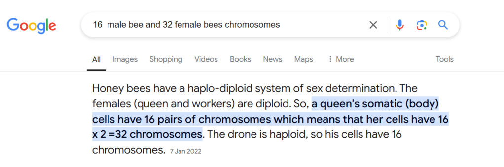 Nyuki wa kike ana Mbegu za Chromosomes 32 na Nyuki wa kiume ana mbegu za Chromosomes 16.