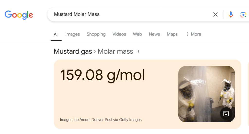 Haya Ni Maajabu Kwani Molecule Ya Gesi Ya Haradali (Mustard Seed) C4H8CI2S Ina Molecular Mass (Uzito katika Mole Moja) 159 Pia!!