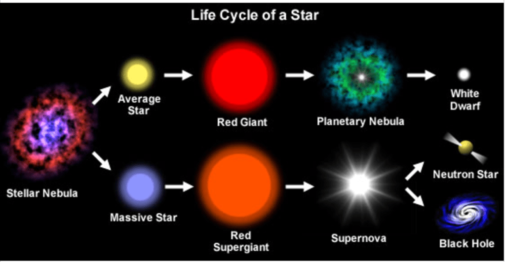 Kwa kifupi Kama tunavyoona katika picha hii kwamba Maisha Ya Nyota huanzia na Kung’ara kwake mpaka inapokufa na kutokutoa mwanga tena, na katika hali hii inapitia daraja mbali mbali kwa majina mbalimbali kufuatana na ukubwa wake.