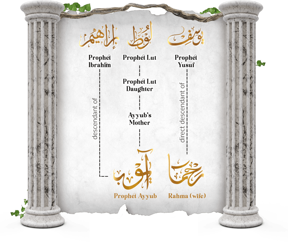 Prophet Ayyub (عَلَيْهِ ٱلسَّلَامُ) was a descendant of Prophet Ibrahim (عَلَيْهِ ٱلسَّلَامُ) and believed by some to have a mother who was the daughter of Prophet Lut (عَلَيْهِ ٱلسَّلَامُ). His wife, Rahma, was a descendant of Prophet Yusuf (عَلَيْهِ ٱلسَّلَامُ). They lived in Rome and had fourteen children. Ayyub (عَلَيْهِ ٱلسَّلَامُ) was blessed by Allah (سُبْحَٰنَهُۥ وَتَعَٰلَىٰ) with strength, health, large lands, livestock, and a loving family. He was a respected community leader who was humble and always ready to help others, thanking Allah (سُبْحَٰنَهُۥ وَتَعَٰلَىٰ) for his blessings.