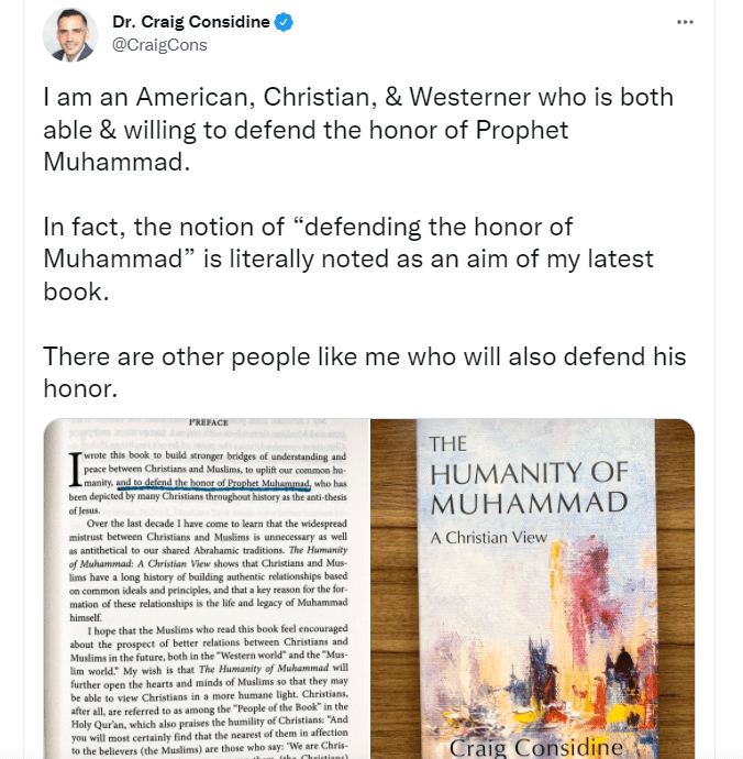 (I am an American, Christian, & Westerner who is both able & willing to defend the honor of Prophet Muhammad. In fact, the notion of “defending the honor of Muhammad” is literally noted as an aim of my latest book)